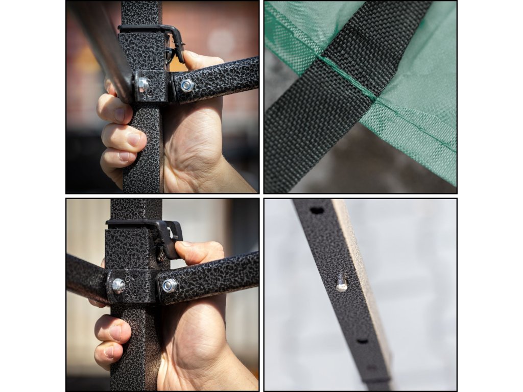 - V súprave: strecha, 3 x stena 3 m, konštrukcia, obal s úchytmi uzatváraný na zips, 8 kolíkov a 4 lanka, návod