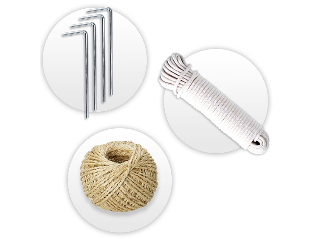 ZDARMA dostanete: 5 tyčí na podopieranie rastlín, sisalový špagát 100 m, 4 kolíky, 4 x 260 cm bieleho špagátu na kotvy.