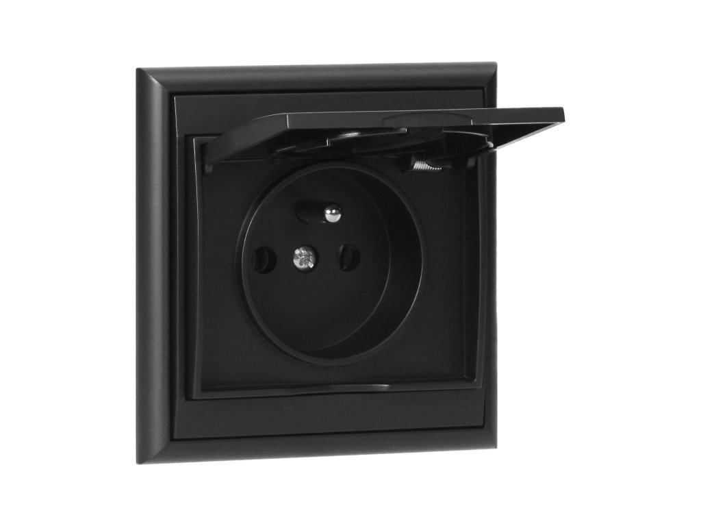 Samostatná francúzska zásuvka typu 2P+E, odolná voči poveternostným podmienkam s krytom. Určená na zapustenú montáž. Je určená na použitie v interiéri (IP20).
