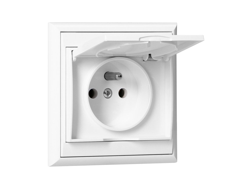Jednolôžková zásuvka francúzskeho typu 2P+E, odolná voči poveternostným podmienkam s krytom. Určená pre montáž na splachovanie. Mala by sa používať v interiéri (IP20).